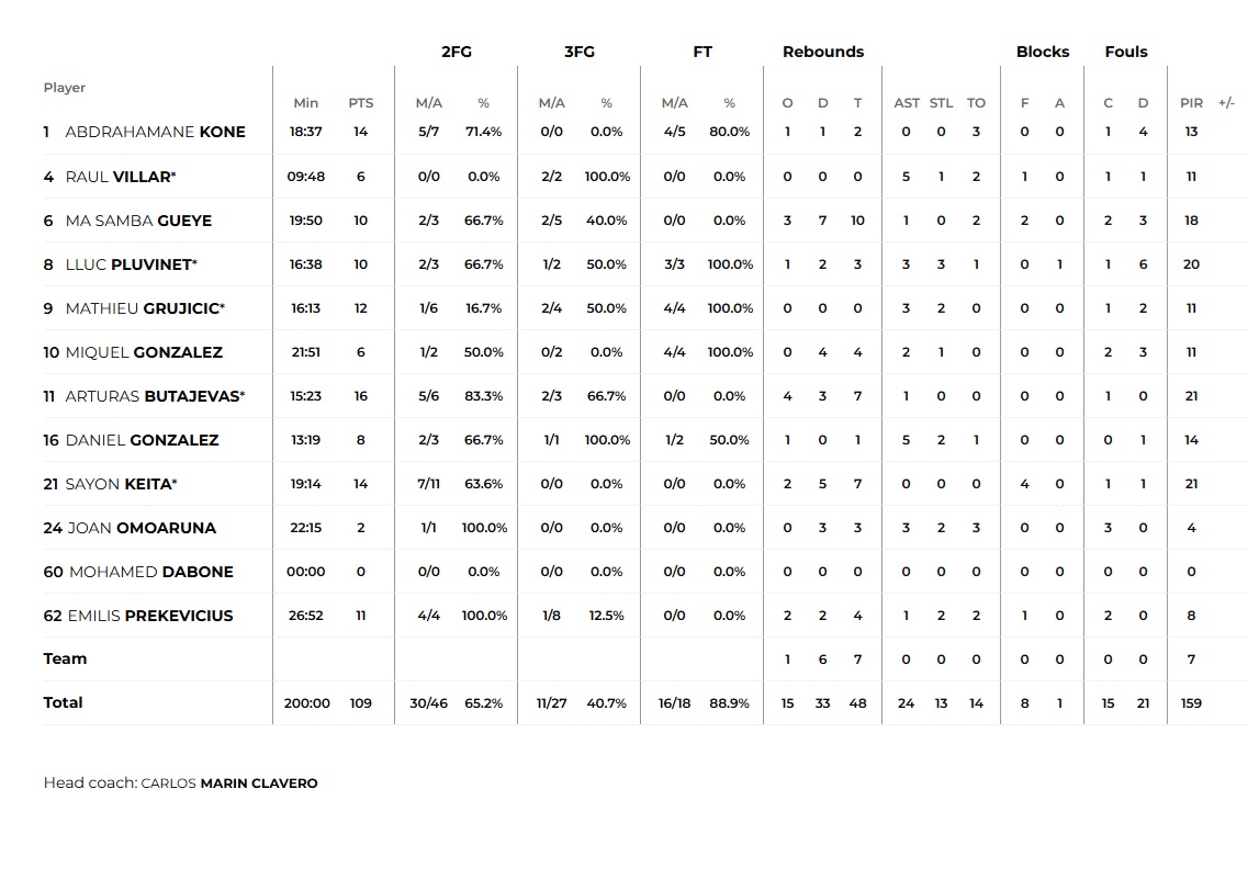 O Ολυμπιακός δέχθηκε ένα σερί 15-0 στην αρχή του αγώνα, αποτέλεσμα της αστοχίας στην επίθεση και της μη απαιτούμενης έντασης στην άμυνά του. Ο Παυλόπουλος ήταν εκείνος που διέκοψε τους «μπλαουγκράνα» (15-2, 6'). Οι Καταλανοί είχαν τον έλεγχο του αγώνα (19-2, 7'), με την περίοδο να ολοκληρώνεται στο 29-6. Λίγα άλλαξαν στο δεύτερο δεκάλεπτο, με τους τυπικά γηπεδούχους να είναι καλύτεροι στο παρκέ και να πηγαίνουν στ' αποδυτήρια με μεγάλη διαφορά (63-23). Με ένα 9-0 σερί στο τρίτο δεκάλεπτο, οι «ερυθρόλευκοι» προσπάθησαν να μειώσουν (74-39, 27'), αλλά χωρίς να καταφέρουν να γίνουν ανταγωνιστικοί (80-50), με το παιχνίδι να ολοκληρώνεται στο 109-61.