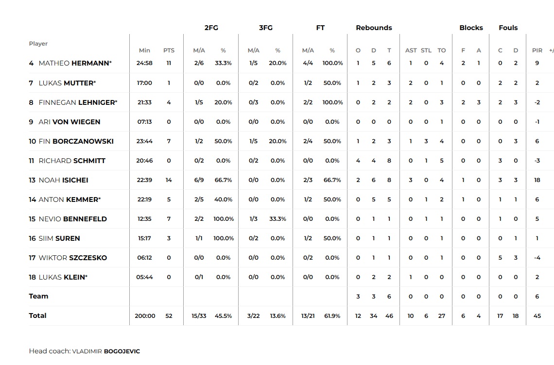 Οι «ερυθρόλευκοι» πήραν μια εμφατική νίκη επί της Άλμπα στο τουρνουά που διεξάγεται στη Γερμανία. Η ομάδα μας ξεκίνησε πολύ δυνατά την αναμέτρηση (8-0, 2') ελέγχοντας το παιχνίδι (3-10, 6'). Κάποια λάθη στη συνέχεια έφεραν το 7-0 της γερμανικής ομάδας (13-14, 8') με την περίοδο να κλείνει στο 17-17. Στο δεύτερο δεκάλεπτο, οι Πειραιώτες ήταν κυρίαρχοι και με 9-0 σερί στα τελευταία λεπτά της περιόδου, πήγαν στα αποδυτήρια για το ημίχρονο στο +10 (25-35). Στο τρίτο δεκάλεπτο, οι τυπικά γηπεδούχοι προσπάθησαν να μειώσουν τη διαφορά και ισοφάρισαν -προσωρινά- σε 39-39 (26'), όμως η ομάδα μας πήρε ξανά τα ηνία στο σκορ, με επιμέρους σκορ 11-2 (41-49). Ένα τρίποντο του Θοδωρή Παυλόπουλου στην αρχή της τελευταίας περιόδου ανέβασε τη διαφορά σε διψήφιο επίπεδο (41-52), με την ομάδα μας να ελέγχει τον ρυθμό του παιχνιδιού και με υπομονή στην επίθεση να χτίζει σταδιακά μεγάλο προβάδισμα (48-68, 36'), μέχρι το τελικό 52-77 και τη νίκη!