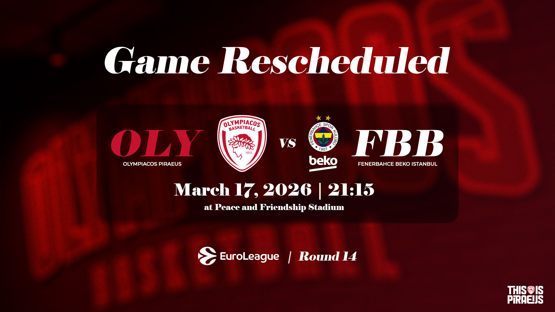 Η εξ’ αναβολής αναμέτρηση της 14ης αγωνιστικής της Ευρωλίγκας με τη Φενέρμπαχτσε προγραμματίστηκε για τις 17 Μαρτίου (21:15).