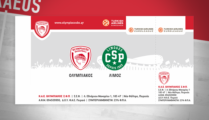Η Διεύθυνση Εισιτηρίων της Κ.Α.Ε. ΟΛΥΜΠΙΑΚΟΣ ανακοινώνει ότι, η διάθεση των εισιτηρίων για τον αγώνα Euroleague, OLYMPIACOS – LIMOGES CSP, ο οποίος θα διεξαχθεί στο Στάδιο Ειρήνης και Φιλίας την Πέμπτη 5/11/2015 με ώρα έναρξης 21:45, θα πραγματοποιηθεί ως εξής: