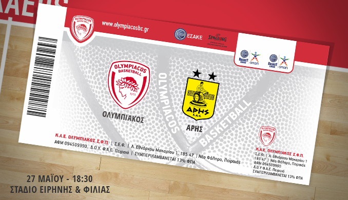 Η Διεύθυνση Εισιτηρίων της Κ.Α.Ε. ΟΛΥΜΠΙΑΚΟΣ ανακοινώνει ότι η διάθεση των εισιτηρίων για τους αγώνες Play offs Ελληνικού Πρωταθλήματος με τον AΡΗ, οι οποίοι θα διεξαχθούν την Τετάρτη 27/05/2015 και την Παρασκευή 29/05/2015 με ώρα έναρξης 18:30 αντίστοιχα πραγματοποιείται ως εξής:
