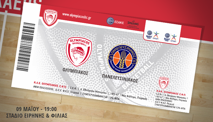 Η Διεύθυνση Εισιτηρίων της Κ.Α.Ε. ΟΛΥΜΠΙΑΚΟΣ ανακοινώνει ότι η διάθεση των εισιτηρίων για τον αγώνα Ελληνικού Πρωταθλήματος με τον ΠΑΝΕΛΕΥΣΙΝΙΑΚΟ Α.Ο.Κ, ο οποίος θα διεξαχθεί το Σάββατο 09/05/2015 με ώρα έναρξης 19:00 πραγματοποιείται ως εξής: