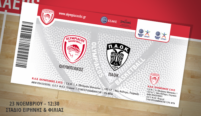 Η Διεύθυνση Εισιτηρίων της Κ.Α.Ε. ΟΛΥΜΠΙΑΚΟΣ ανακοινώνει ότι η διάθεση των εισιτηρίων για τον αγώνα Ελληνικού Πρωταθλήματος με τον ΠΑΟΚ, ο οποίος θα διεξαχθεί την Κυριακή 23/11/2014 με ώρα έναρξης 12:30 πραγματοποιείται ως εξής:
