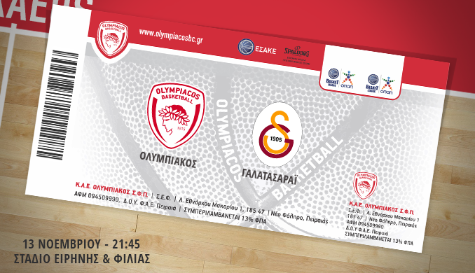 Η Διεύθυνση Εισιτηρίων της Κ.Α.Ε. ΟΛΥΜΠΙΑΚΟΣ ανακοινώνει ότι η διάθεση των εισιτηρίων για τον αγώνα Euroleague, OLYMPIACOS – GALATASARAY LIV HOSPITAL ISTANBUL, ο οποίος θα διεξαχθεί την Πέμπτη 13 Νοεμβρίου 2014 με ώρα έναρξης 21:45 πραγματοποιείται ως εξής: