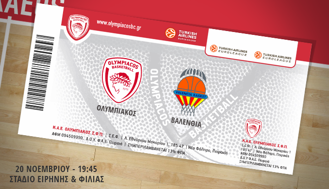 Η Διεύθυνση Εισιτηρίων της Κ.Α.Ε. ΟΛΥΜΠΙΑΚΟΣ ανακοινώνει ότι η διάθεση των εισιτηρίων για τον αγώνα Euroleague, OLYMPIACOS – VALENCIA BASKET, ο οποίος θα διεξαχθεί την Πέμπτη 20 Νοεμβρίου 2014 με ώρα έναρξης 19:45 πραγματοποιείται ως εξής: