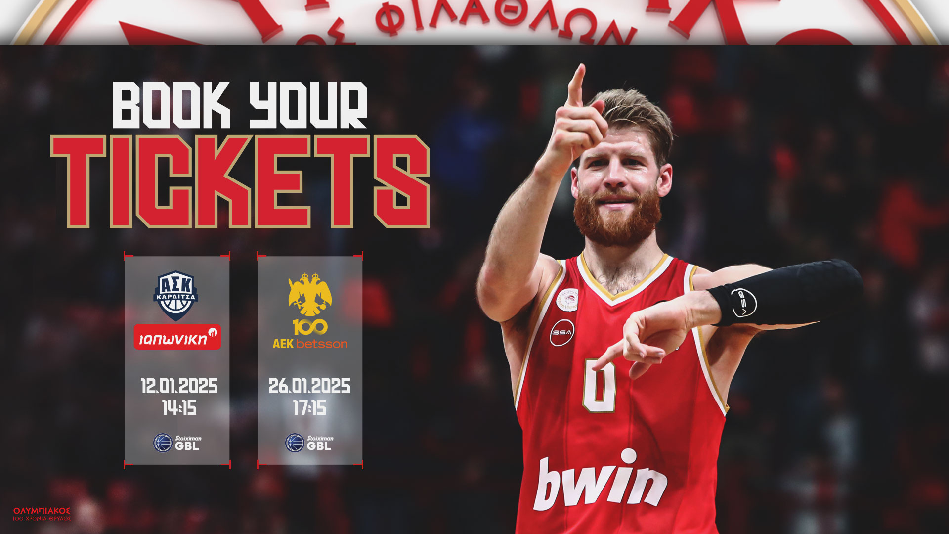 Ξεκινά η πώληση των εισιτηρίων για τα παιχνίδια πρωταθλήματος κόντρα στις Καρδίτσα (12/01) και ΑΕΚ (26/01), ενώ παράλληλα συνεχίζεται η προπώληση για τους Ευρωπαϊκούς Αγώνες του Ιανουαρίου!