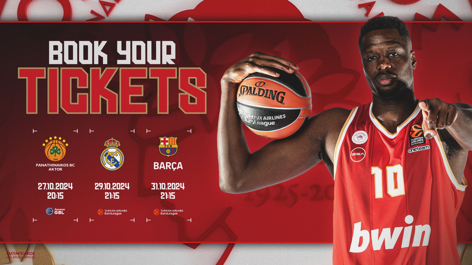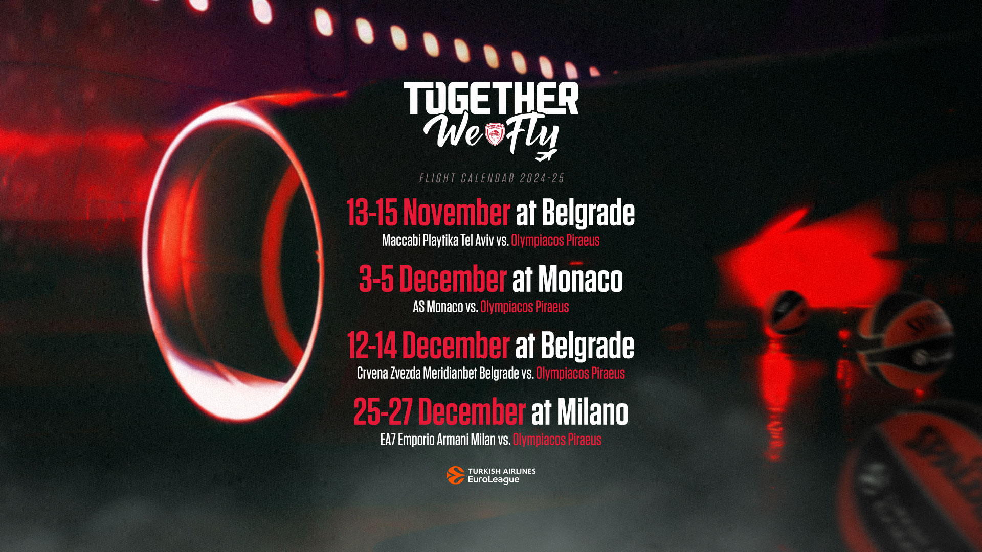 Λίγο πριν το πρώτο ταξίδι του “Together We Fly” για τη φετινή σεζόν στο Μόναχο, η ΚΑΕ Ολυμπιακός κάνει... τζάμπολ στην υποβολή συμμετοχών σε τέσσερις ακόμη εκτός έδρας αναμετρήσεις: Βελιγράδι (Μακάμπι Τ.Α.), Μονακό (AS Monaco), Βελιγράδι (Ερυθρός Αστέρας) και Μιλάνο (E7 Emporio Armani Milan)!