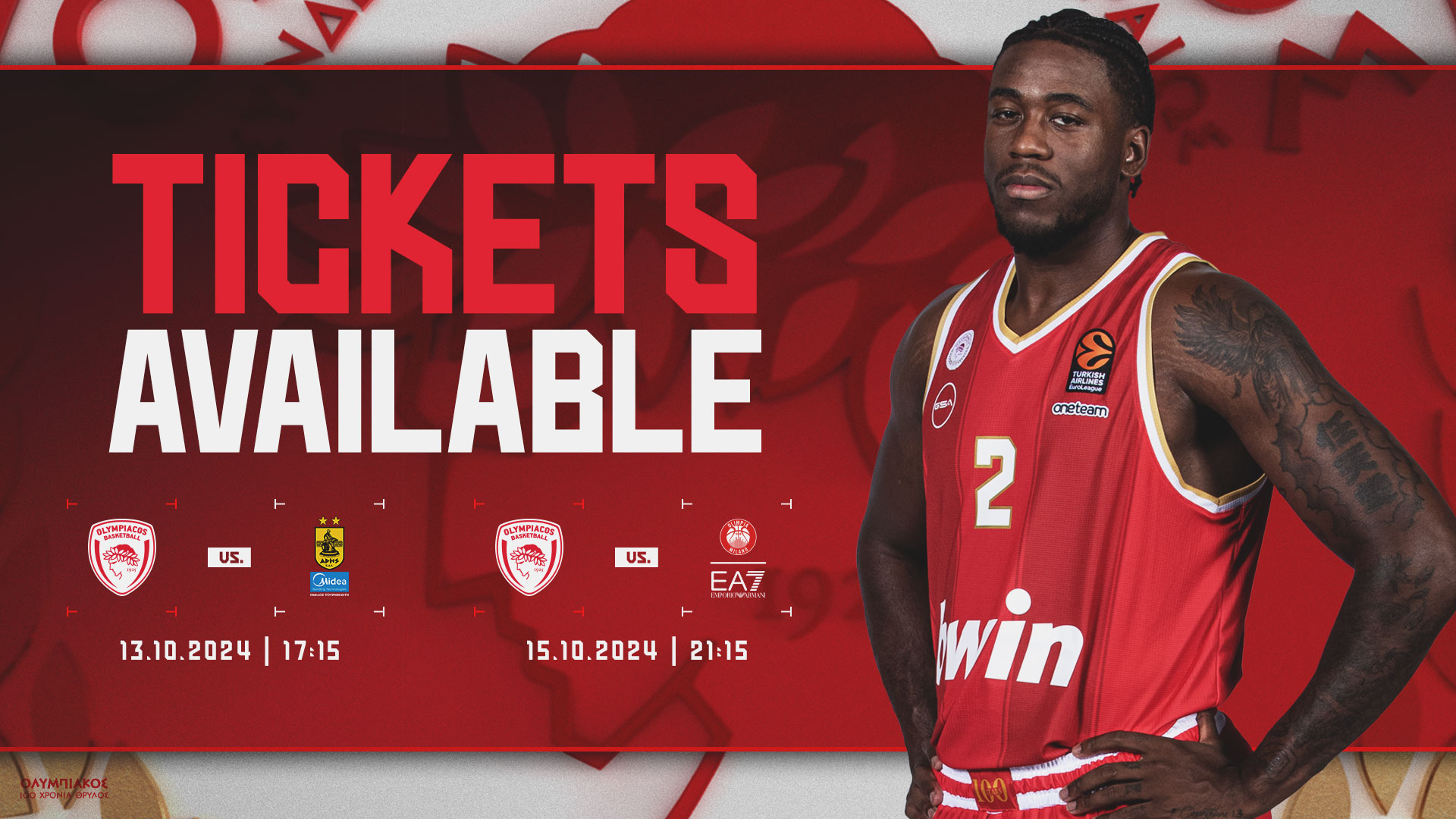 Η Κ.Α.Ε. ΟΛΥΜΠΙΑΚΟΣ ανακοινώνει ότι για τον αγώνα Ελληνικού Πρωταθλήματος Stoiximan Basket League 2024 - 2025 με τον ΑΡΗ MIDEA 13/10/2024, με ώρα έναρξης 17:15 και για τον αγώνα Euroleague με την EA7 EMPORIO ARMANI MILAN 15/10/2024, με ώρα έναρξης 21:15 η διάθεση των εισιτηρίων πραγματοποιείται ως…