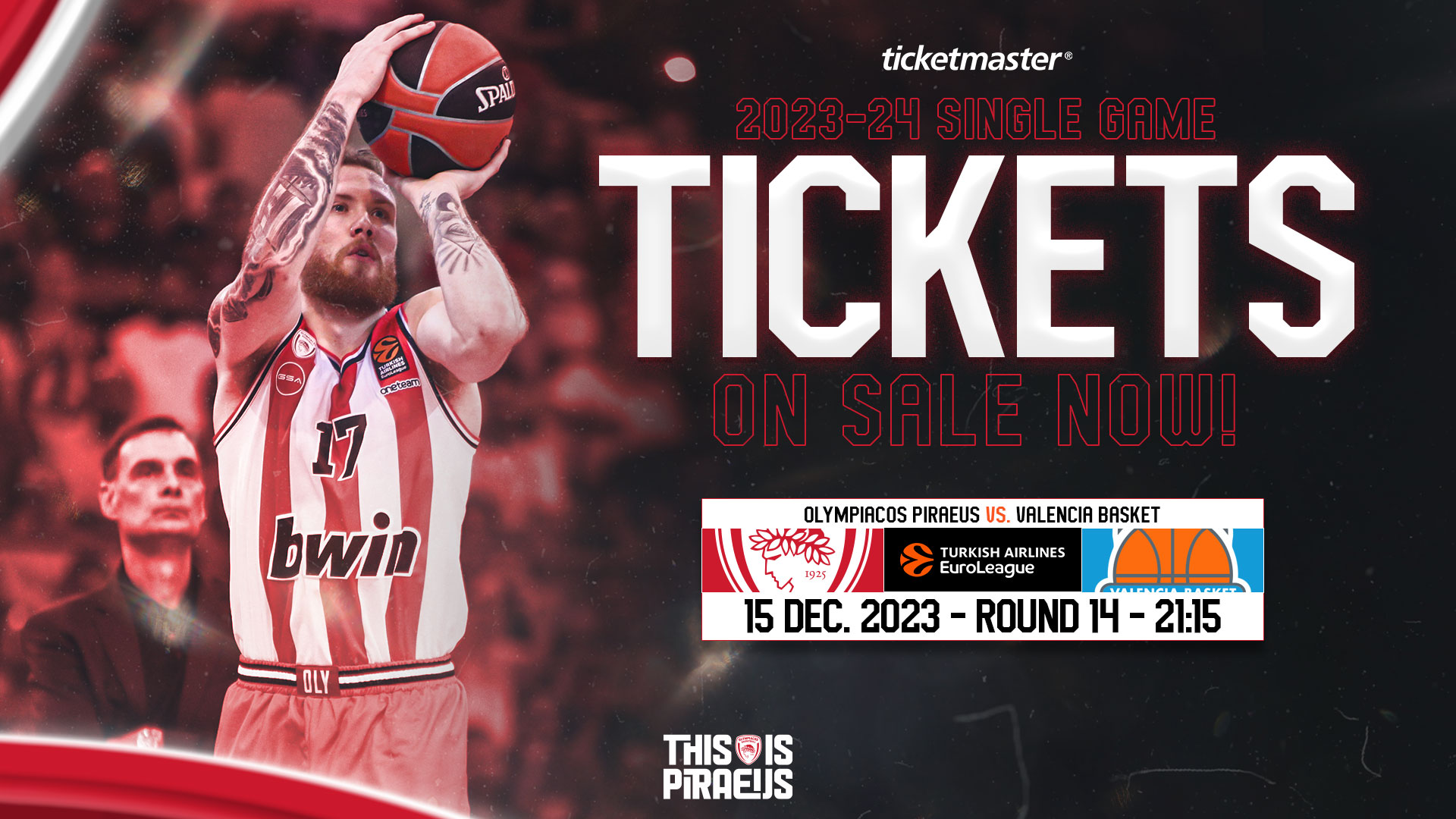 H Κ.Α.Ε ΟΛΥΜΠΙΑΚΟΣ ανακοινώνει ότι, για τον αγώνα με την VALENCIABASKET της ΠΑΡΑΣΚΕΥΗΣ 15/12/2023 με ώρα έναρξης 21:15, η διάθεση των εισιτηρίων γίνεται: