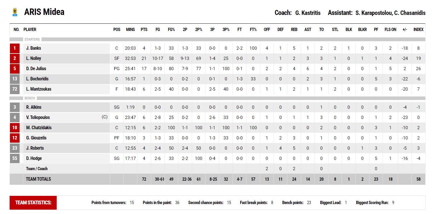 Με τον Μουστάφα Φαλ να κυριαρχεί στη ρακέτα και ωραίες συνεργασίες επιθετικά, ο Ολυμπιακός ξεκίνησε με το πόδι στο γκάζι το παιχνίδι με τον Άρη. «Έτρεξε» ένα γρήγορο 6-0 (8-3, 3') και επέβαλε ολοκληρωτικά τον ρυθμό του. Ο Άρης δυσκολευόταν να περιορίσει τους «ερυθρόλευκους» που κυριαρχούσαν και στις δύο πλευρές του παρκέ ολοκληρώνοντας την πρώτη περίοδο με 14 ασίστ και μόλις 1 λάθος (35-12). Στη δεύτερη περίοδο, η ομάδα μας ξεκίνησε με νέα πρόσωπα στην πεντάδα, αλλά την ίδια ένταση σε επίθεση και άμυνα. Ο Ντόρσεϊ στο 11' ανέβασε τη διαφορά στο +25 (40-15), οι Θεσσαλονικείς με δύο διαδοχικά τρίποντα μείωσαν στο -19 (42-23, 14'), όμως ο Ολυμπιακός ήταν επιβλητικός και πήγε στο ημίχρονο στο +26 (57-31).