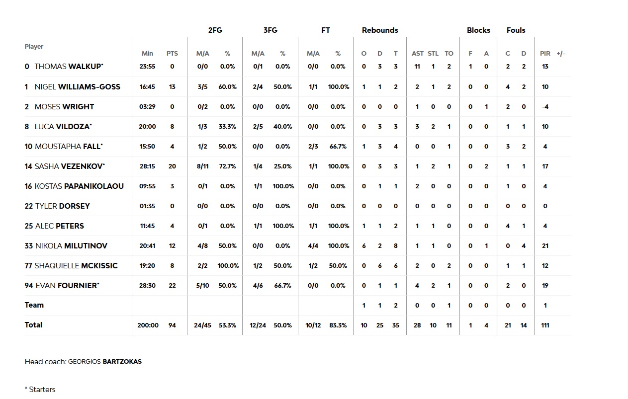 Με συγκέντρωση στην άμυνα και τους Σάσα Βεζένκοφ και Εβάν Φουρνιέ να πρωταγωνιστούν επιθετικά, ο Ολυμπιακός ξεκίνησε δυναμικά στο ντέρμπι με τον Παναθηναϊκό στο ΟΑΚΑ. Οι Πειραιώτες ήλεγξαν απόλυτα τον ρυθμό και στις δύο πλευρές του παρκέ (1-7,3' και 1-11, 4') δεχόμενοι καλάθι μετά από περισσότερα από τέσσερα αγωνιστικά λεπτά. Οι Πράσινοι αντέδρασαν τρέχοντας ένα σερί 7-0 (13-15, 9'), όμως ένα τρίποντο του Παπανικολάου και 2 βολές του Μιλουτίνοφ «φρέναραν» τους γηπεδούχους, με την περίοδο να κλείνει στο 15-20. Στο δεύτερο δεκάλεπτο η ομάδα μας βρήκε νέους πρωταγωνιστές στα πρόσωπα των Γουίλιαμς Γκος και Νίκολα Μιλουτίνοφ και με ένα σερί 7-0 (15-27, 14') πήρε διαφορά 12 πόντων. Ο Σέρβος σέντερ ήταν κυρίαρχος στα ριμπάουντ και ο Αμερικανός γκαρντ έδινε πολλές λύσεις επιθετικά με τη διαφορά να ανεβαίνει στο +13 (25-38, 18'). Στα τελευταία δύο λεπτά της περιόδου, τα λάθη και κάποιες κακές επιλογές στην επίθεση, επέτρεψαν στον Παναθηναϊκό να «τρέξει» ένα επί μέρους 8-3, με το ημίχρονο να ολοκληρώνεται στο 33-41.