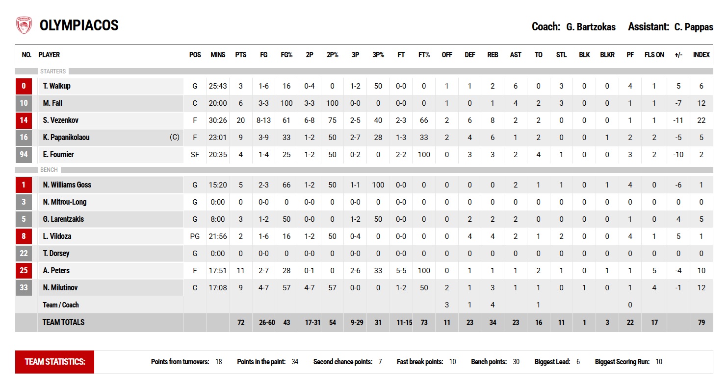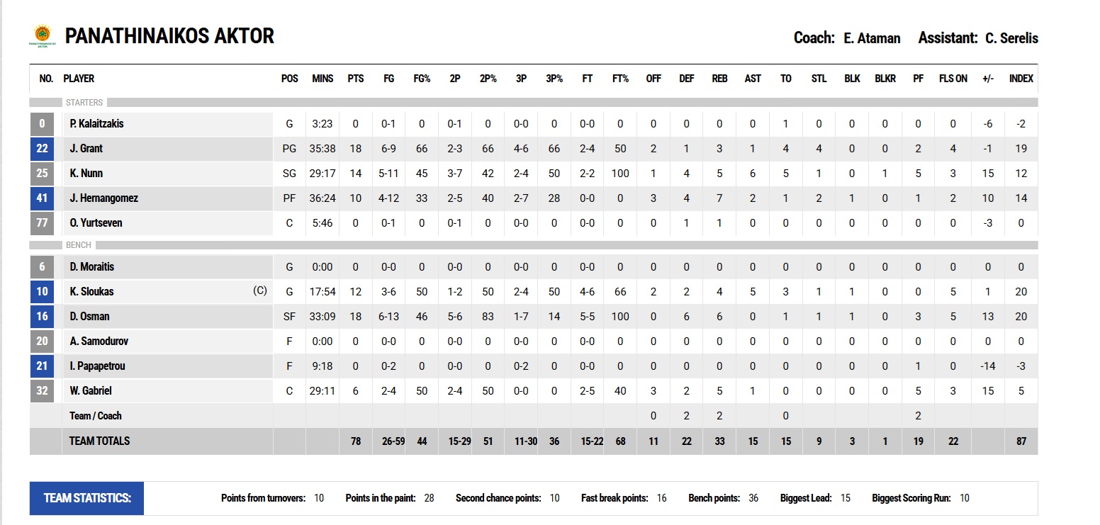 Ο Ολυμπιακός ξεκίνησε καλά το παιχνίδι με τον Παναθηναϊκό στο ΟΑΚΑ με κυκλοφορία της μπάλας και τον Μουστάφα Φαλ να «τελειώνει» κάτω απ' το καλάθι και συγκέντρωση στ' αμυντικά του καθήκοντα (4-10, 4'). Γρήγορα, όμως, η πίεση στη μπάλα των γηπεδούχων οδήγησε σε πολλά λάθη τους Πειραιώτες και το προβάδισμα άλλαξε χέρια (14-12,7'). Η ομάδα μας ήταν άστοχη από την περιφέρεια και δεν είχε την απαιτούμενη ένταση στην άμυνά της, με αποτέλεσμα να δεχθεί ένα επιμέρους σκορ 15-2 (19-12, 8') και να βρεθεί στο -9 στο τέλος της περιόδου (25-14). Στο δεύτερο δεκάλεπτο, η «ερυθρόλευκη» άμυνα συνέχισε να μην αποδίδει, ενώ στην επίθεση, δεν υπήρχε καθαρό μυαλό (31-17, 12'). Το πρώτο εύστοχο σουτ τριών πόντων ήρθε δια χειρός Γιαννούλη Λαρεντζάκη (31-20), για να ακολουθήσουν δύο ακόμα διαδοχικά από τον Άλεκ Πίτερς (35-26, 17') κι ένα σερί 10-0 για τους «ερυθρόλευκους» που «τάισαν» τον Μιλουτίνοφ κι έριξαν τη διαφορά στους 5π. (35-30, 18'). Το ημίχρονο ολοκληρώθηκε στο 38-30, μετά από αλλεπάλληλα χαμένα αμυντικά ριμπάουντ.