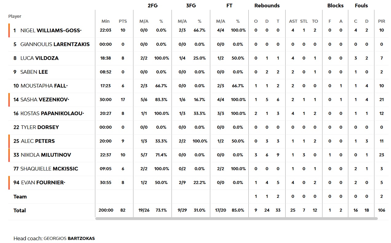 Δεκάλεπτα: 27-18, 46-32, 64-51, 82-70