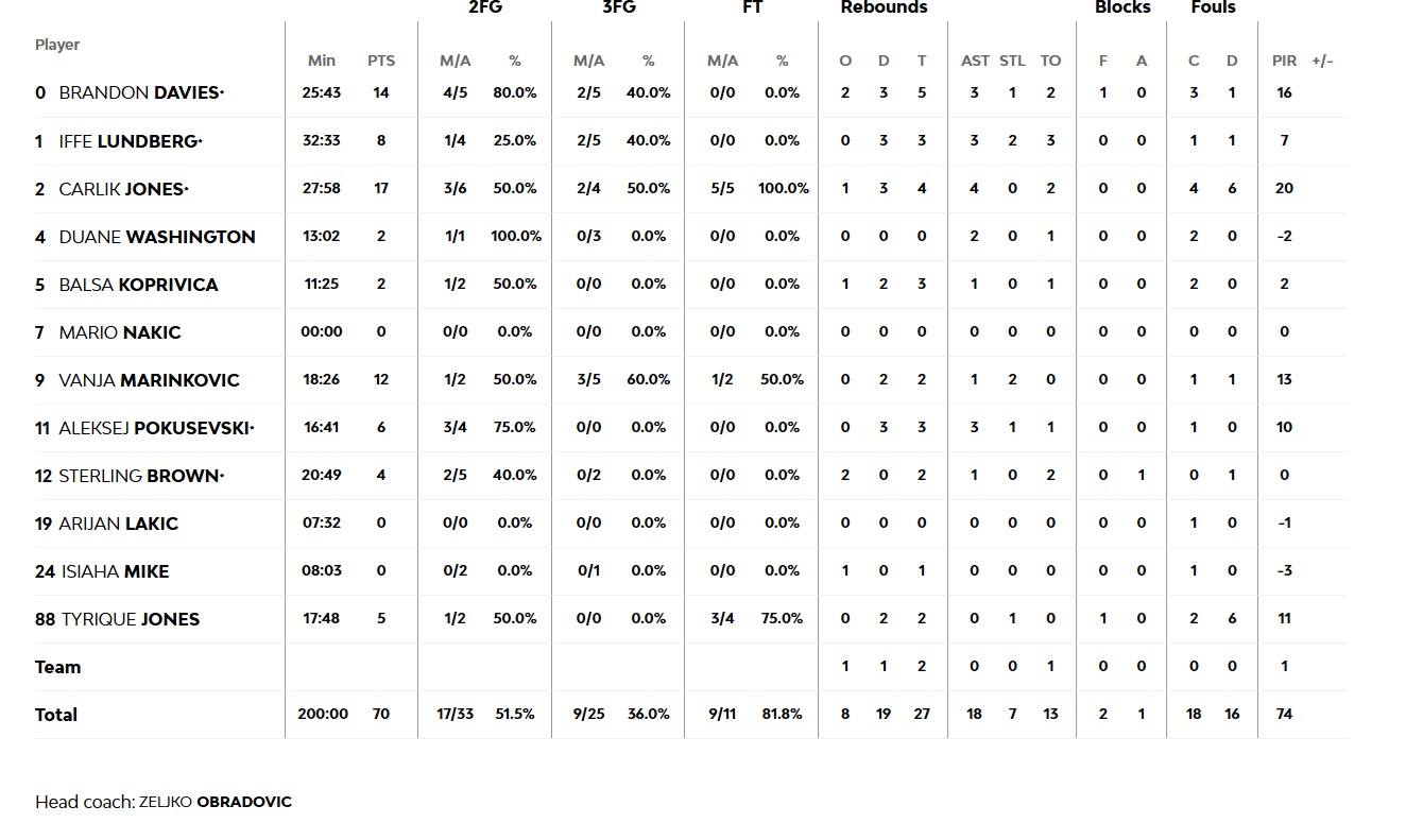 Οι «ερυθρόλευκοι» συνέχισαν να ελέγχουν απόλυτα το παιχνίδι και στην τελευταία περίοδο, χωρίς να απειλούνται από την αντίπαλό τους (68-53, 32'). Η ομάδα του Ομπράντοβιτς μπορεί να ανέβασε την ένταση στην άμυνά της, βρήκε όμως απέναντί της έναν εξαιρετικά ψύχραιμο και συγκεντρωμένο Ολυμπιακό. Ένα μπάζερ μπίτερ τρίποντο του Νάιτζελ Γουίλιαμς Γκος (35') έβαλε φρένο στο μίνι σερί των Σέρβων, ενώ ο Νίκολα Μιλουτίνοφ πρωταγωνίστησε και στις δύο πλευρές του παρκέ τελειώνοντας φάσεις κοντά στο καλάθι και όντας καθοριστικός στο αμυντικό μισό (77-61, 37'), με την ομάδα μας να παίρνει μια ακόμα νίκη (82-70) παραμένοντας μόνη πρώτη στην κορυφή της βαθμολογίας!