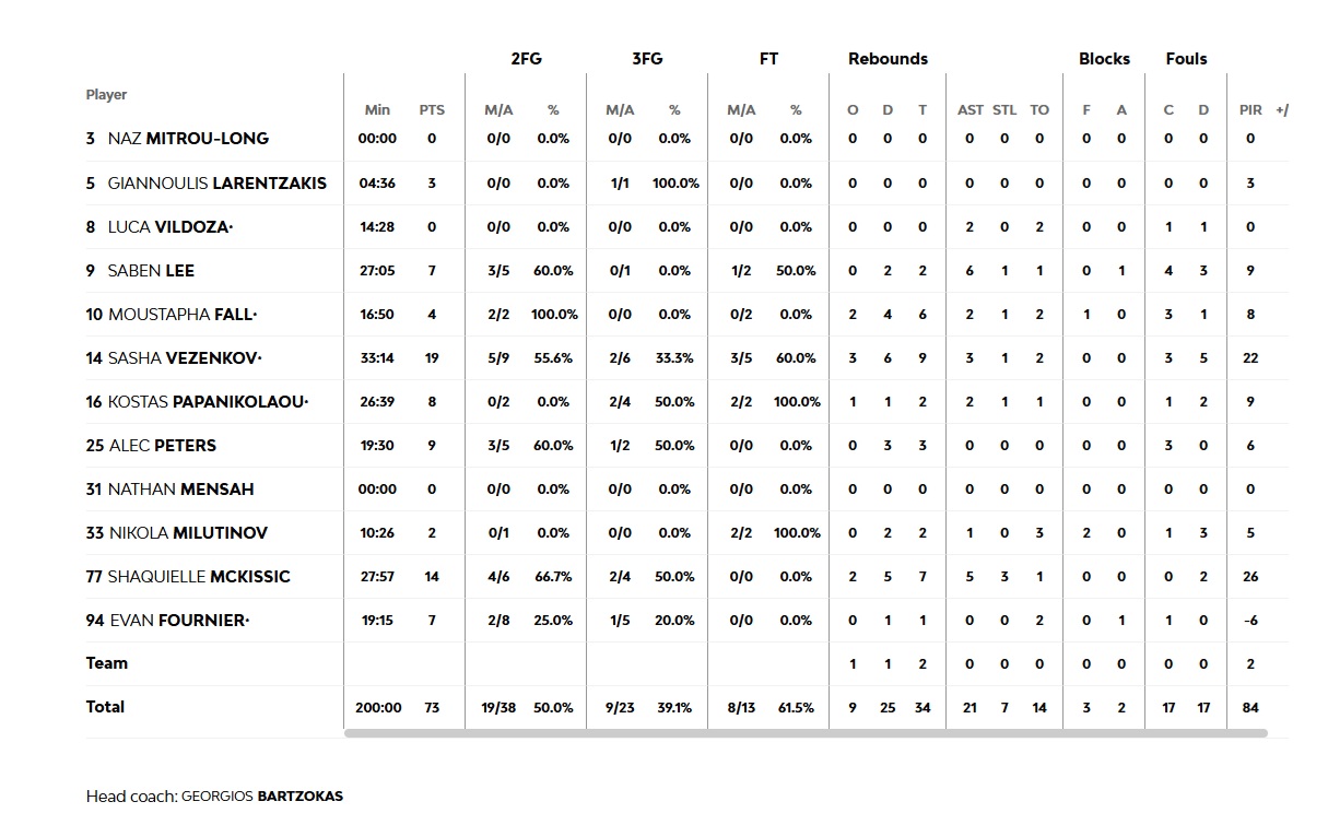 Δύο «αναπάντητα» τρίποντα του Κώστα Παπανικολάου, δύο διαδοχικές καλές άμυνες κι ακόμα 2 πόντοι του αρχηγού, έριξαν τη διαφορά σε μονοψήφιο επίπεδο στην αρχή της τρίτης περίοδου (35-43, 22'). Ενώ ένα κλέψιμο του captain και πέντε πόντοι του Σάσα Βεζένκοφ (40-47) έδωσαν συνέχεια στην αντεπίθεση της ομάδα μας. Ο Βούλγαρος φόργουορντ και ο Σακίλ ΜακΚίσικ ήταν εκείνοι που πήραν την σκυτάλη από τον Κώστα Παπανικολάου «χτυπώντας» από τα 6.75, ενώ η περίοδος έκλεισε με καλάθι του Φαλ μετά από ασίστ του αρχηγού και μπλοκ του Γάλλου σέντερ στην τελευταία επίθεση του Ερυθρού (55-58)! Στην τελευταία περίοδο, η κακή περιφερειακή άμυνα έφερε τρία διαδοχικά «αναπάντητα» τρίποντα των φιλοξενούμενων που έχτισαν και πάλι διαφορά ασφαλείας (59-72, 34'). Ο Άλεκ Πίτερς ήταν εκείνος που βγήκε μπροστά επιθετικά στο τελευταίο τρίλεπτο, ρίχνοντας τη διαφορά σε μονοψήφιο επίπεδο (67-76, 38' και (71-77, 39'), όμως ο Ερυθρός ήταν ψύχραιμος από τη γραμμή των ελ. βολών και έφτασε στη νίκη με 81-73. Η ομάδα μας, που έχει εξασφαλίσει την παρουσία της στα play offs, παραμένει πρώτη στη βαθμολογία και στρέφει την προσοχή της στην επόμενη αγωνιστική της διοργάνωσης.