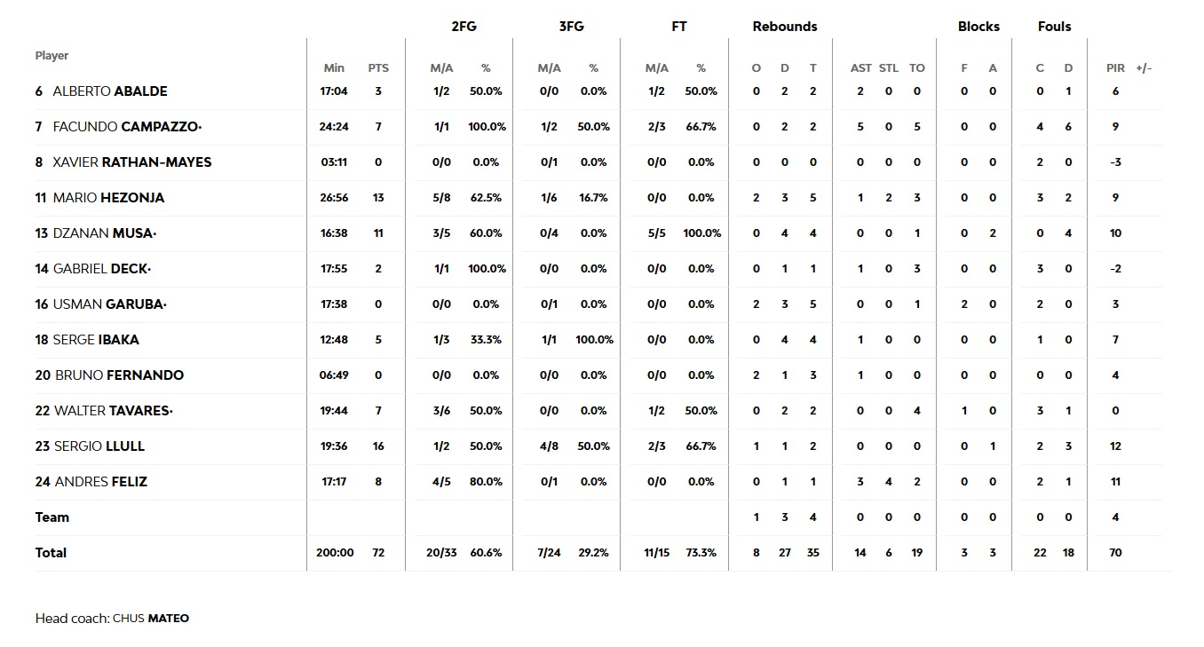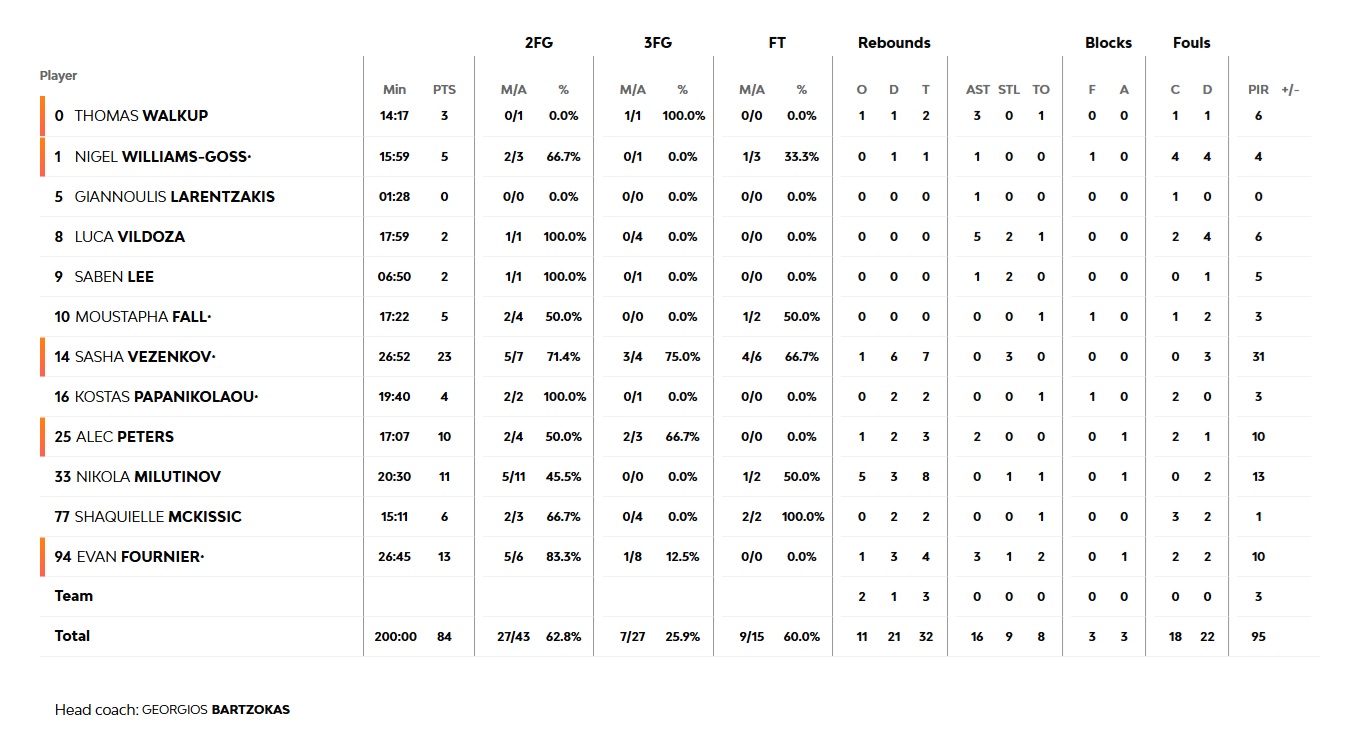 Το τρίποντο του Σάσα Βεζένκοφ στην αρχή της τρίτης περιόδου διαμόρφωσε το +21 (50-29), με τη Ρεάλ να προσπαθεί να αντεπιτεθεί δια χειρός Καμπάτσο, αλλά την ομάδα μας να παραμένει κυρίαρχη. Ο Λούκα Βιλντόζα «τάισε» για το κάρφωμα του Φαλ, ενώ ο Σάσα Βεζένκοφ έκλεψε και τελείωσε στον αιφνιδιασμό (56-37). Με μικρά σερί οι Μαδριλένοι έριξαν τη διαφορά (56-41) εκμεταλλευόμενοι κάποια λάθη της ομάδα μας και την αστοχία από την περιφέρεια. Ο Εβάν Φουρνιέ συνέχισε να δίνει λύσεις επιθετικά (58-41, 25') όταν οι φιλοξενούμενοι προσπάθησαν να βρουν ρυθμό, με το δεκάλεπτο να κλείνει στο 64-51 δια χειρός Γάλλου. Στα πρώτα λεπτά της τελευταίας περιόδου, ήταν η στιγμή του Άλεκ Πίτερς να βγει μπροστά επιθετικά (70-53, 33'). Οι Μαδριλένοι «χτυπώντας» από την περιφέρεια έκαναν την τελική τους αντεπίθεση, αλλά οι Τόμας Γουόκαπ, Εβάν Φουρνιέ και Άλεκ Πίτερς είχαν... τρίποντη «απάντηση» (82-67), με το παιχνίδι να ολοκληρώνεται στο 84-72 και την ομάδα μας να κάνει το 1-0 στη σειρά.