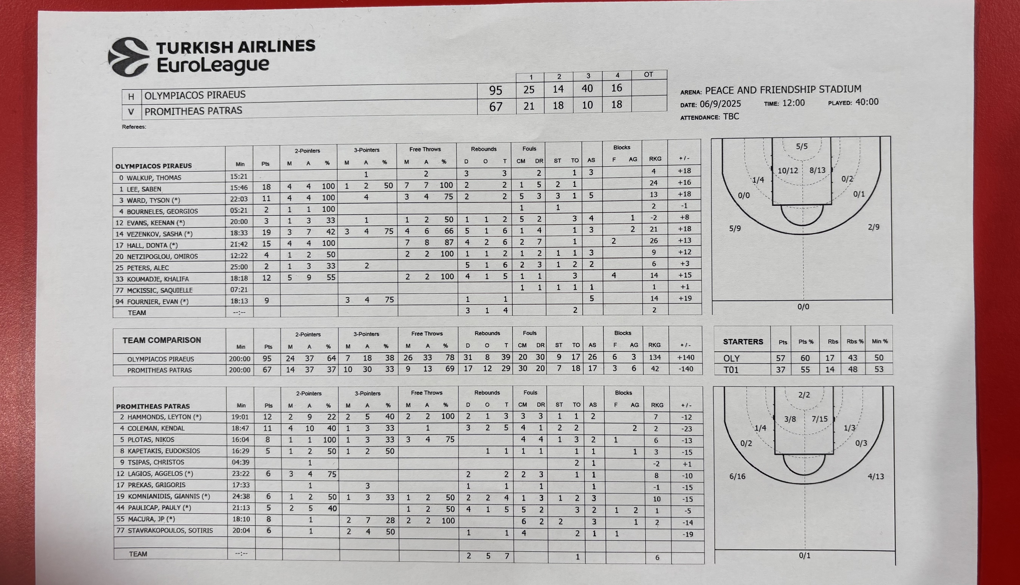 Με τους Κίναν Έβανς, Τάισον Γουόρντ, Ντόντα Χολ, Όμηρο Νετζήπογλου να ντεμπουτάρουν ανεπίσημα με τα ερυθρόλευκα [όπως κι ο Καλίφα Κουμάντζε, που βοηθά στην προετοιμασία] και τον κόουτς Γιώργο Μπαρτζώκα να δοκιμάζει πολλά διαφορετικά σχήματα, δίνοντας χρόνο συμμετοχής σε όλους τους διαθέσιμους παίκτες του, ξεκίνησε η ομάδα μας τα φιλικά προετοιμασίας της ενόψει της νέας σεζόν. Με εντυπωσιακό τρίτο δεκάλεπτο (επιμέρους σκορ 40-10), οι Πειραιώτες επικράτησαν 95-67 του Προμηθέα Πατρών ξεκινώντας με τον καλύτερο τρόπο τα φιλικά τους για το 2025/2026.
