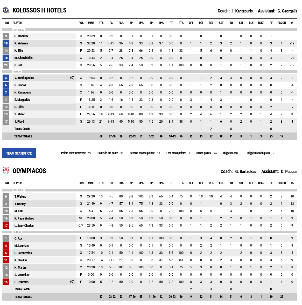 Βασιζόμενοι στην υπεροχή του Μουστάφα Φαλ κάτω από τα καλάθια, οι «ερυθρόλευκοι» πήραν μια διαφορά 9π. (7-16 στο 7’). Ο Κολοσσός εκμεταλλεύτηκε τα πολλά λάθη της ομάδας μας και με επιθετικό οδηγό τον Φλόιντ κατάφερε με ένα επί μέρους σκορ 11-3 να μειώσει στον πόντο (18-19 στο 11’).