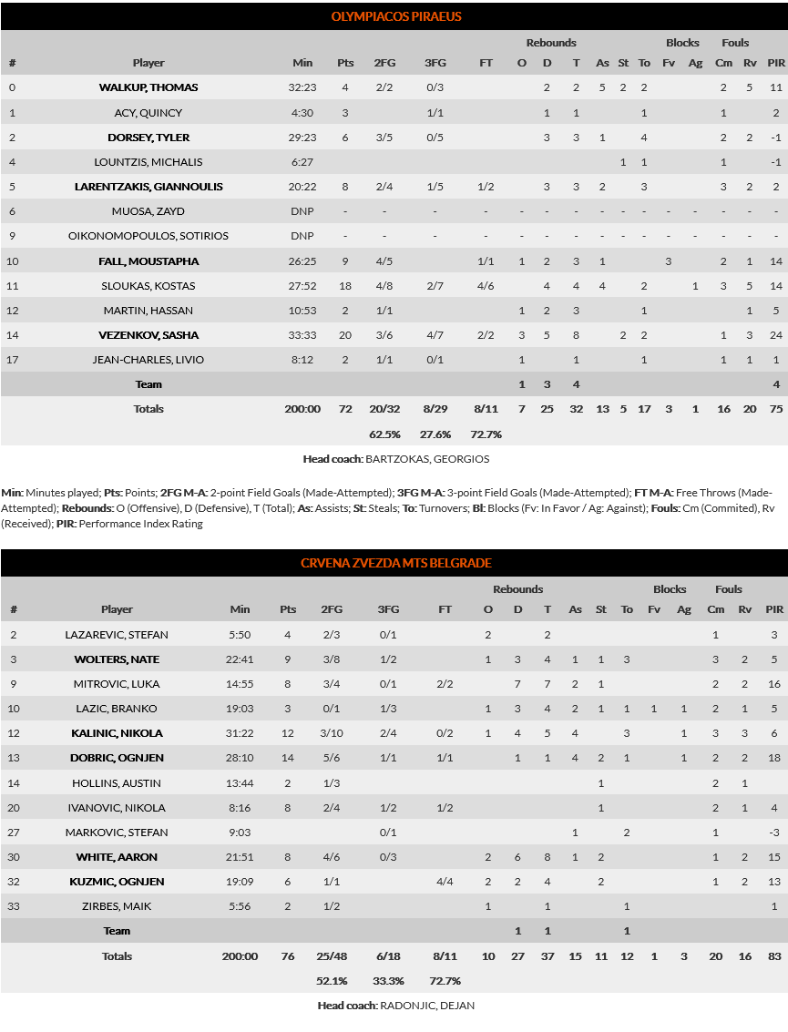 Ο «λαβωμένος» Ολυμπιακός – παρατάχθηκε χωρίς τους Πρίντεζη, Παπανικολάου και ΜακΚίσικ- δεν κατάφερε να διατηρήσει το ευρωπαϊκό αήττητο της έδρας του. Ηττήθηκε στο ΣΕΦ από τον Ερυθρό Αστέρα με 72-76, στο πλαίσιο της 23ης αγωνιστικής της Ευρωλίγκας.