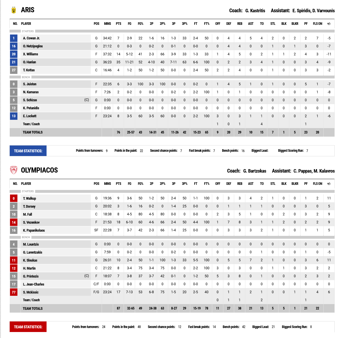 Ο Ολυμπιακός επιβλήθηκε στο «Nick Galis Hall» του Άρη με 87-76, στην εξ’ αναβολής αναμέτρηση της 11ης αγωνιστικής της Stoiximan Basket League.