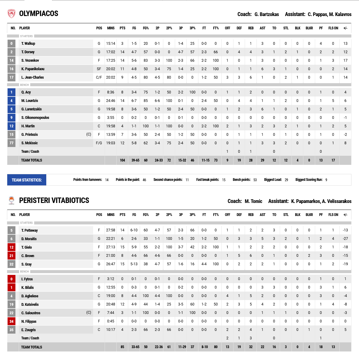 Οι Κώστας Παπανικολάου και Λιβιό Ζαν-Σαρλ φρόντισαν να αυξήσουν ακόμη περισσότερο τις αποστάσεις (+29, 77-48 στο 26’). Όμως, το Περιστέρι αντέδρασε... Με όπλο του το μακρινό σουτ μείωσε σε 89-69 στο 32’, ενώ εκμεταλλευόμενο τα λάθη και της κακές επιλογές της ομάδας μας έριξε τη διαφορά στους 18π. (96-78 στο 36’). Ως εκεί, όμως... Με λέι άπ ο Γιαννούλης Λαρεντζάκης «έγραψε» το 100-78 στο 38’, ενώ ο Ολυμπιακός έφτασε στην τελική επικράτηση με χαρακτηριστική άνεση (104-85).