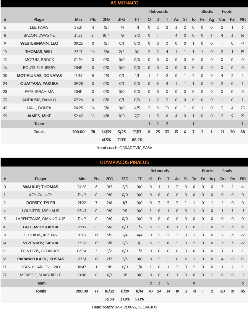 Με τον Φαλ να κυριαρχεί κάτω από τα καλάθια, η ομάδα μας αύξησε τις αποστάσεις για πρώτη φορά στους 11π. (38-49) στο 22’. Οι γηπεδούχοι εκμεταλλεύτηκαν τις κακές επιθετικές επιλογές των «ερυθρολεύκων» και τα κενά στην άμυνά τους και πλησίασαν στον πόντο (51-52). Ο Ολυμπιακός ανέκτησε τον έλεγχο (51-57), όμως, προσωρινά, καθώς στην συνέχεια τίποτα δεν λειτούργησε σωστά σε άμυνα και επίθεση, με αποτέλεσμα η Μονακό να προσπεράσει με ένα επί μέρους σκορ 19-4 με 9π. (70-61) στο 32’.