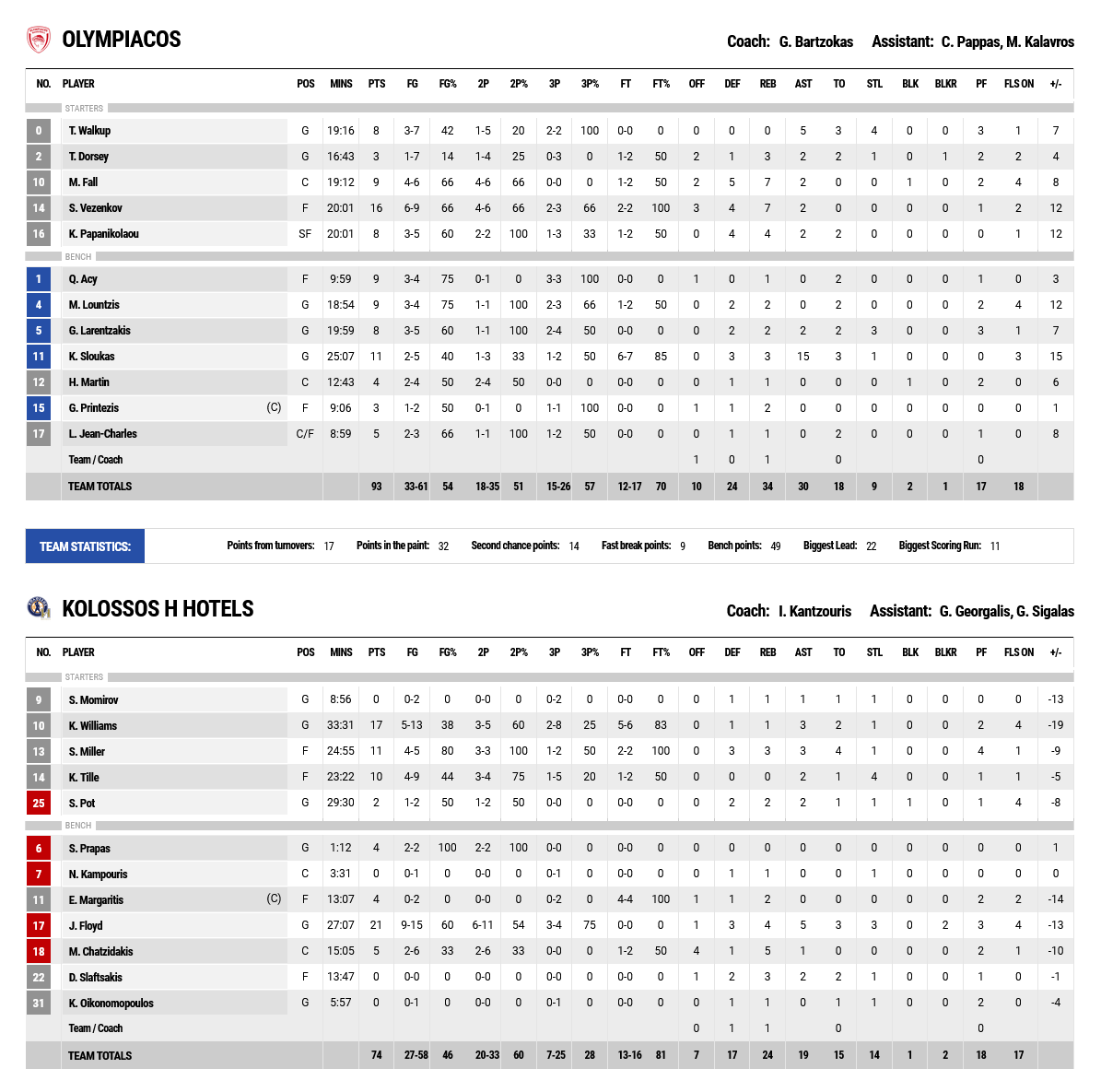 Δεκάλεπτα: 26-12, 43-25, 67-51, 93-74.