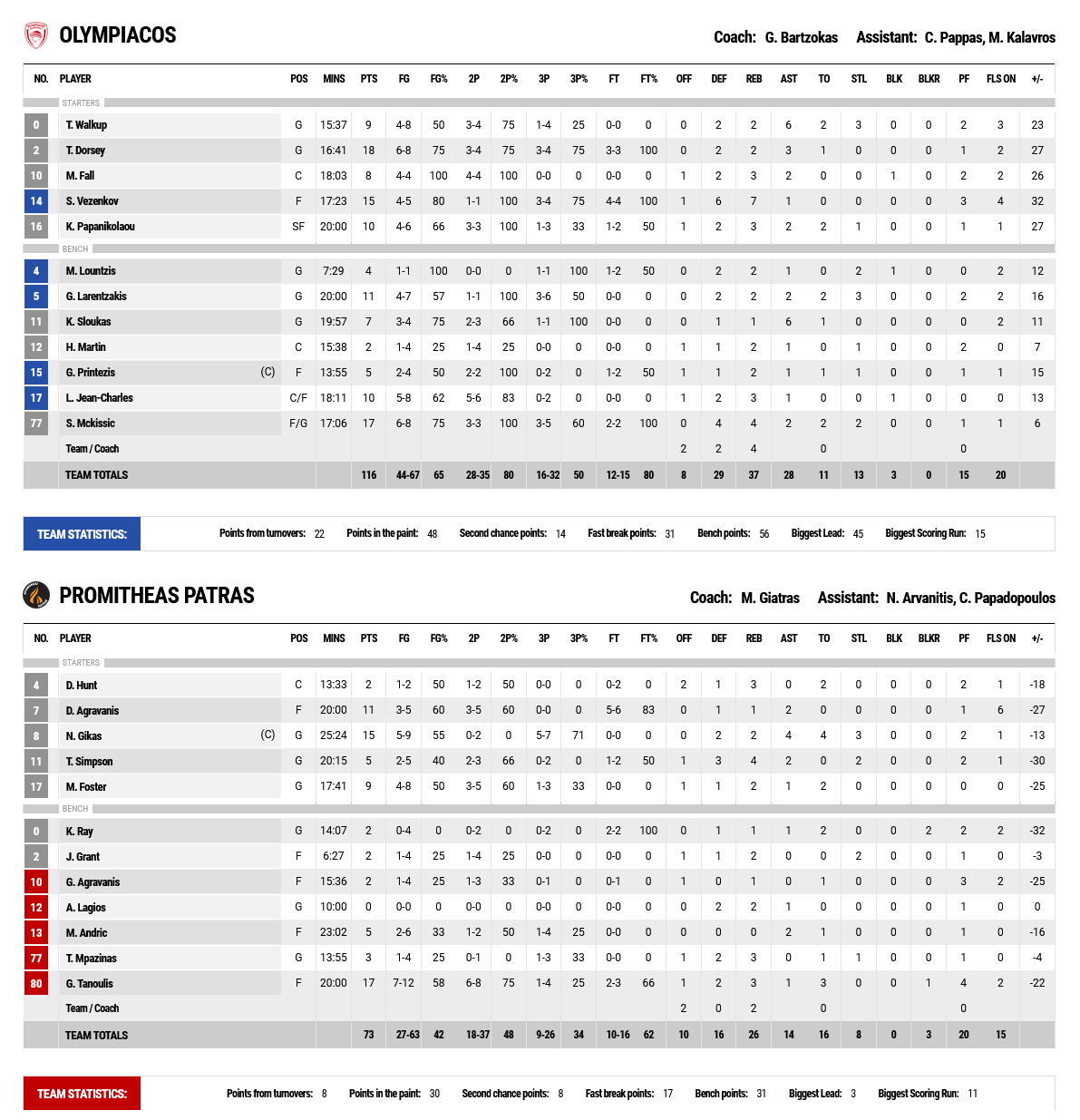 Ο Ολυμπιακός συνέτριψε στο ΣΕΦ τον Προμηθέα Πάτρας με 116-73 και έκανε το πρώτο βήμα για πρόκριση στον τελικο της Stoiximan Basket League.