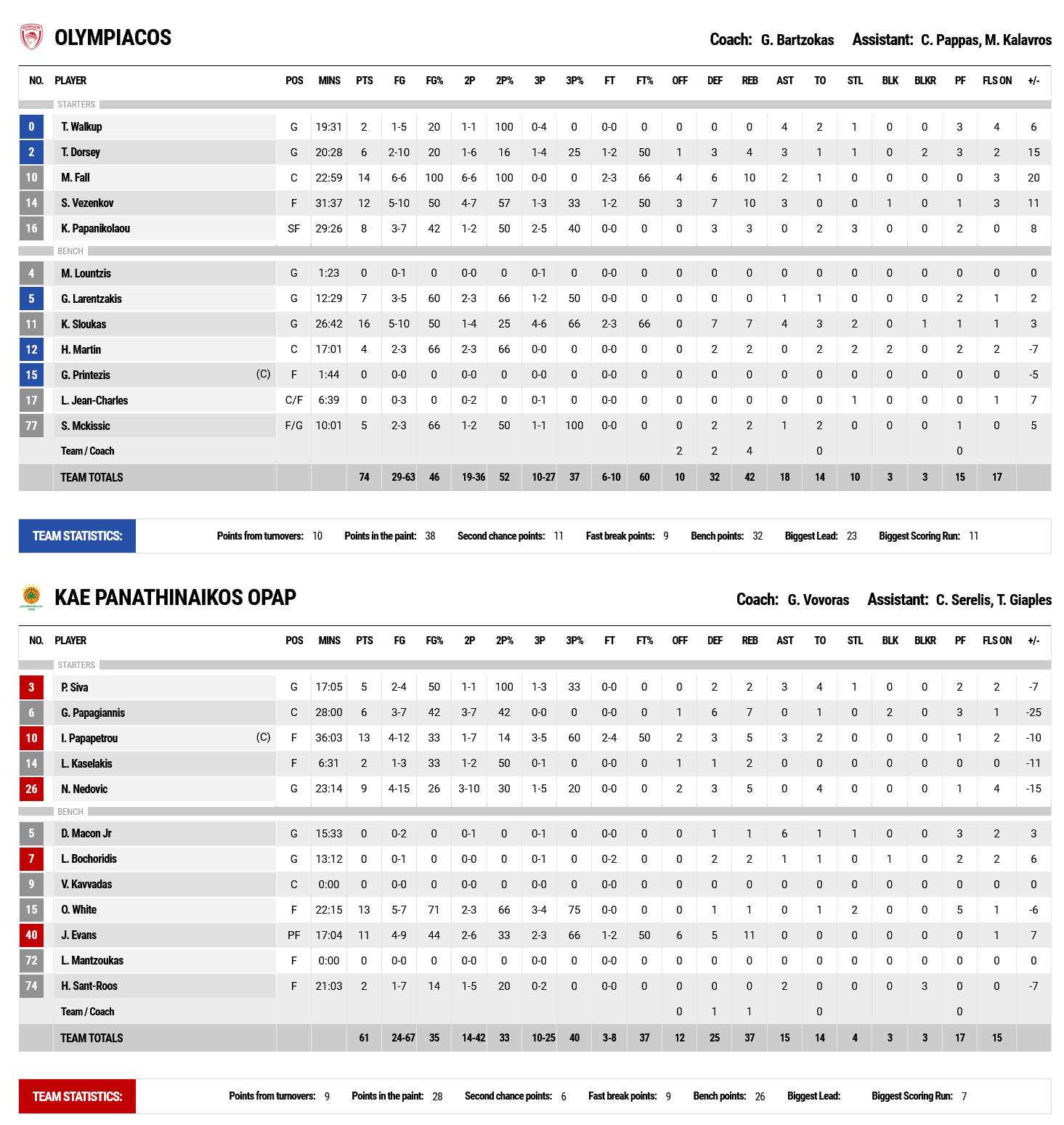 Δεκάλεπτα: 23-4, 38-20, 55-38, 74-61.
