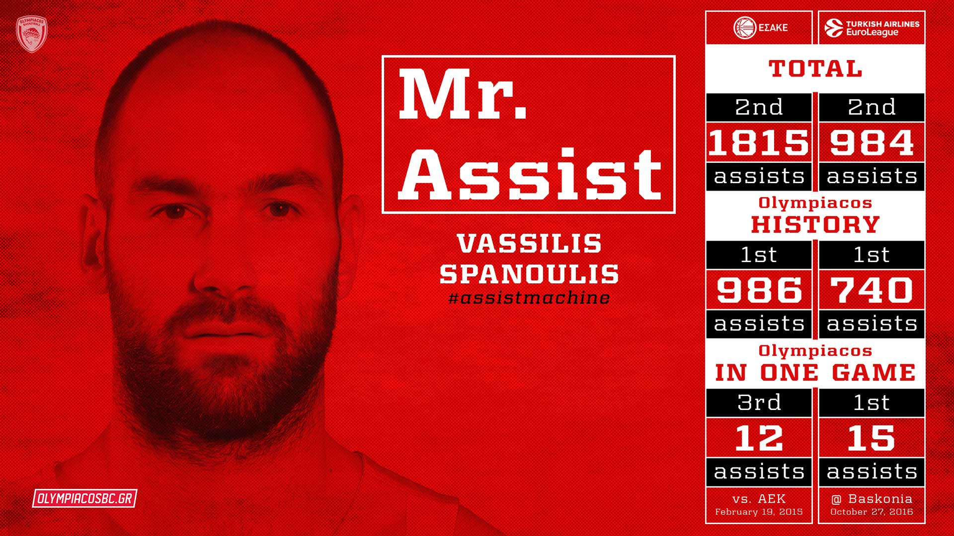 Το βράδυ της 27ης Οκτωβρίου 2016 είναι πολύ σημαντικό τόσο για τον Βασίλη Σπανούλη όσο και για τον Ολυμπιακό. Οι «ερυθρόλευκοι» πανηγύρισαν μια μεγάλη νίκη επί της Μπασκόνια, αλλά το συγκεκριμένο παιχνίδι θα μείνει στην ιστορία για τα κατορθώματα του αρχηγού του Θρύλου.