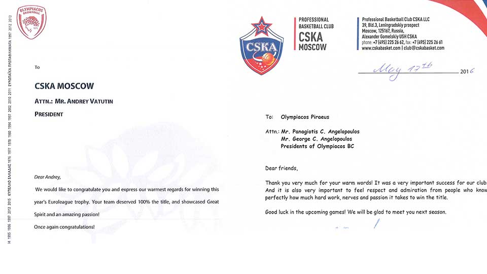 Olympiacos' Presidents Messrs. Panagiotis and Giorgos Angelopoulos sent a congratulatory letter to the President of CSKA Moscow, Mr. Andrey Vatutin in respect to winning this year's Euroleague.